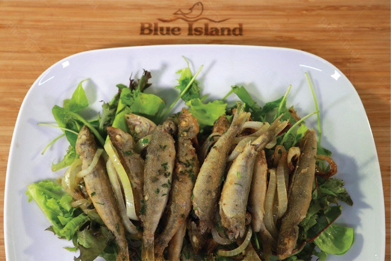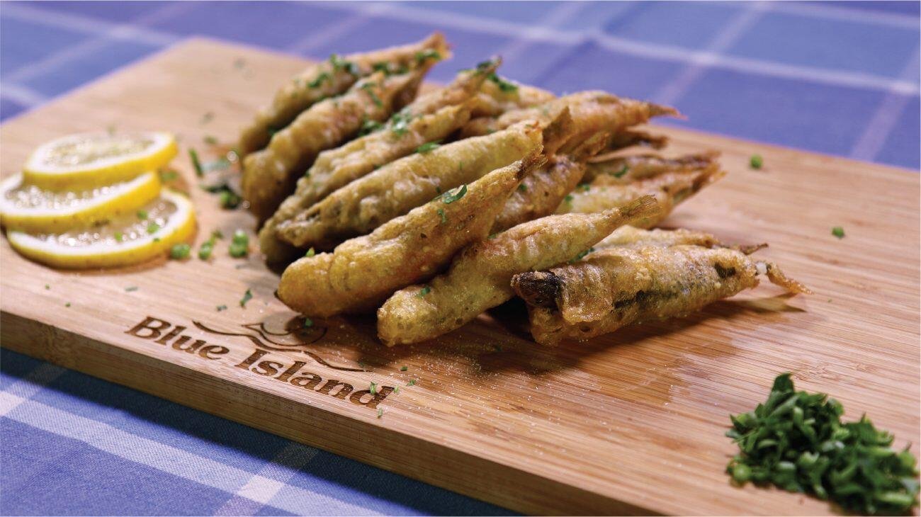 Προμηθευόμαστε τα ψάρια μας καθαρισμένα από τις ψαραγορές μας Blue Island. Αλευρώνουμε και τηγανίζουμε...