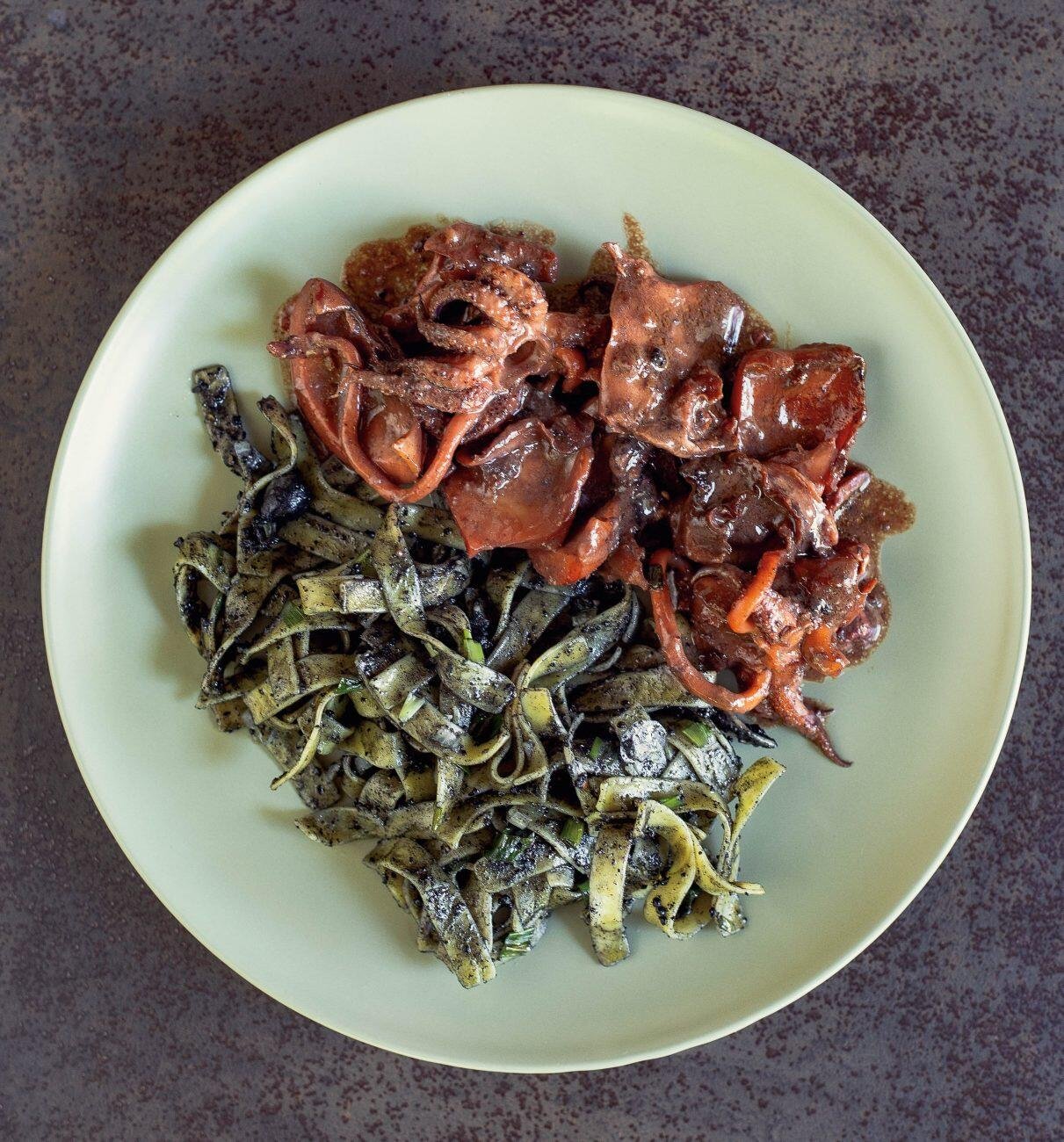 Σουπιές με έψημα σερβιρισμένες με ταλιατέλες με μελάνι