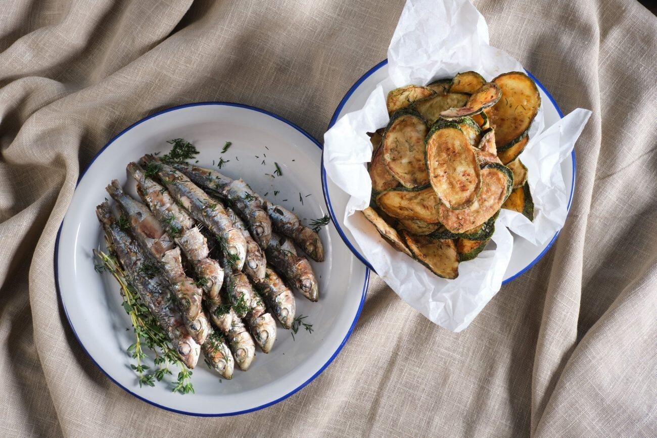 Σαρδέλες στη σχάρα μαριναρισμένες με Σκόρδο, ξύσμα Λεμονιού και φρέσκο Θυμάρι σερβιρισμένες με Τσιπς Κολοκυθιού