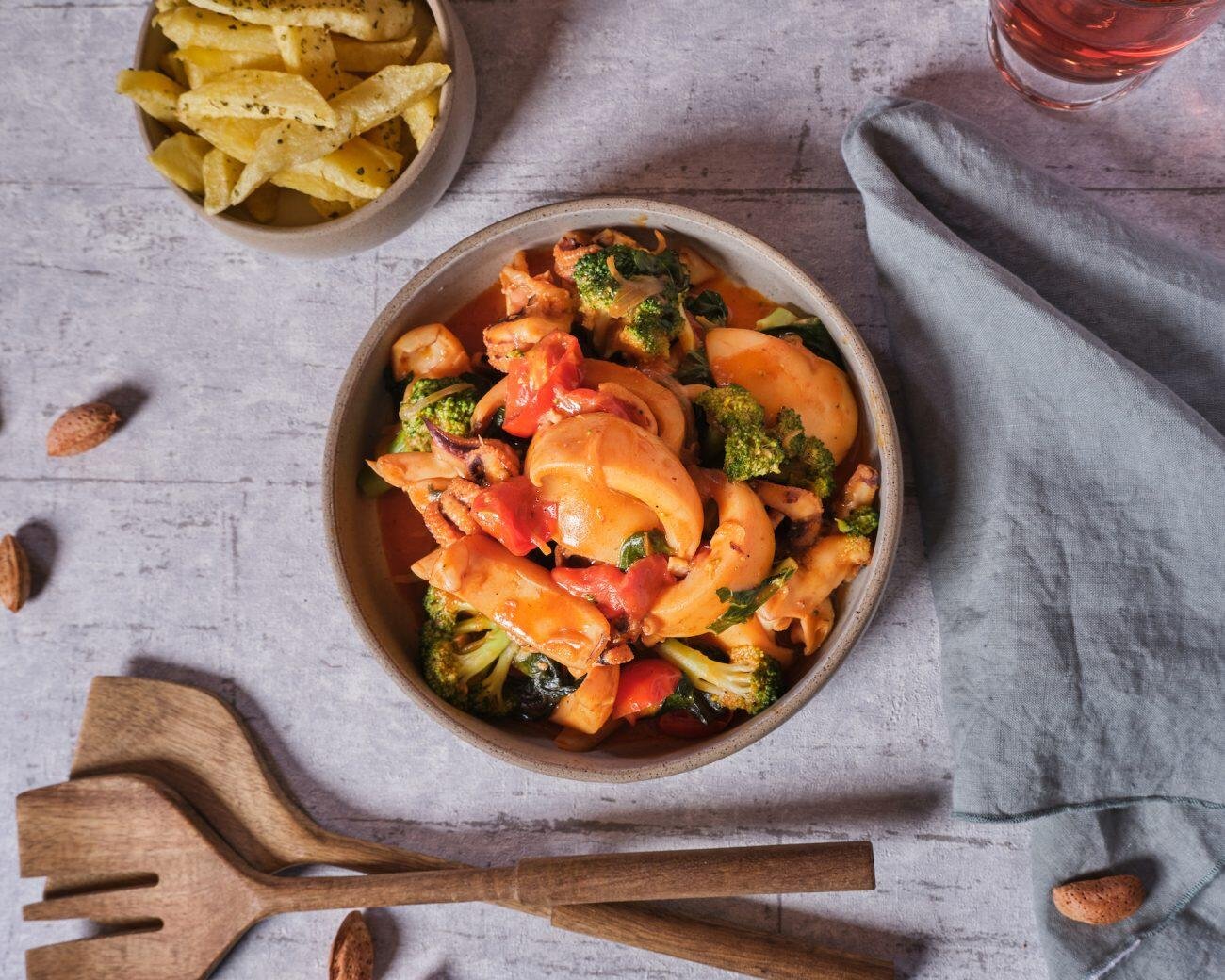 Σουπιές Κοκκινιστές με Λάχανα και Μπρόκολο σερβιρισμένες με Πατάτες Τηγανιτές
