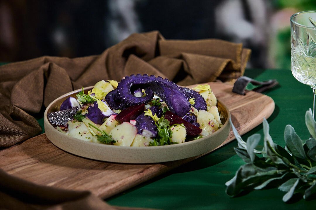 Χταπόδι Μαρινάτο σε κόκκινο Λάχανο με Πατατοσαλάτα