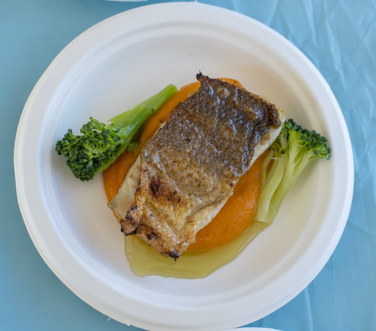 Μαριναρισμένο Φιλέτο Λαβράκι με εσπεριδοειδή σερβιρισμένο με πουρέ από γλυκοπατάτα και καρότο, βραστά λαχανικά και κρεμώδες σάλτσα πορτοκαλιού
