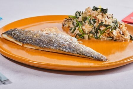 Κατσαρόλα Κυρίως-Πιάτο Μαριναρισμένα Μικροί Σεφ Τηγάνι Μαριναρισμένο Φιλέτο Λαβράκι με εσπεριδοειδή σερβιρισμένο με πουρέ από γλυκοπατάτα και καρότο, βραστά λαχανικά και κρεμώδες σάλτσα πορτοκαλιού