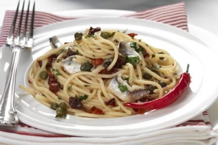 Μακαρονάδα με γαύρο μαρινάτο και λιαστή ντομάτα