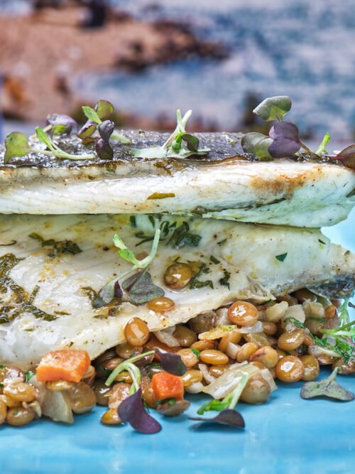 Προμηθευόμαστε τα φιλέτα Τσιπούρας από τις Ψαραγορές BlueIsland. Για τις φακές Σε μια κατσαρόλα προσθέ