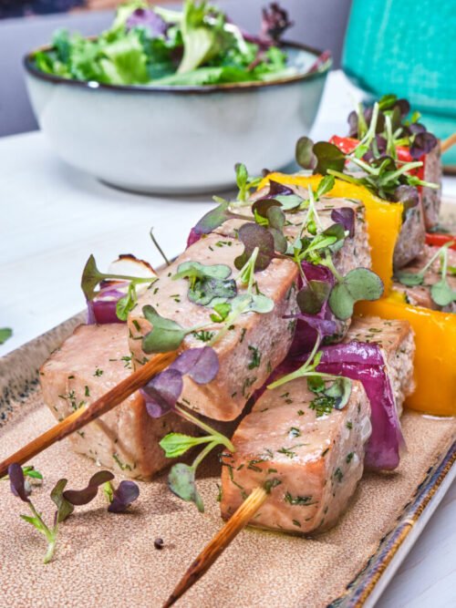 Τόνος σουβλάκι με γλυκιές πιπεριές και κόκκινο κρεμμύδι