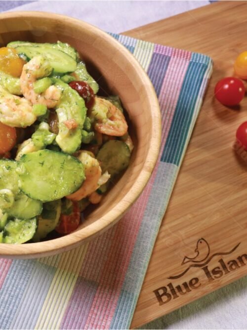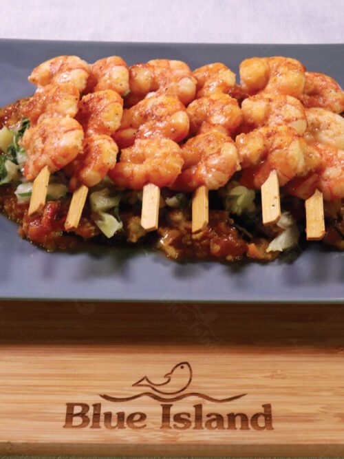Προμηθευόμαστε τα θαλασσινά μας από τις Ψαραγορές Blue Island. Ψήνουμε τις γαρίδες μας σε αλατισμένο ζε
