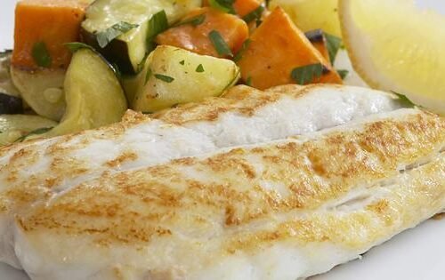 Στέικ Φαγκρί στο φούρνο με Μεσογειακή σάλτσα σερβιρισμένο με γλυκοπατάτα τζάκετ