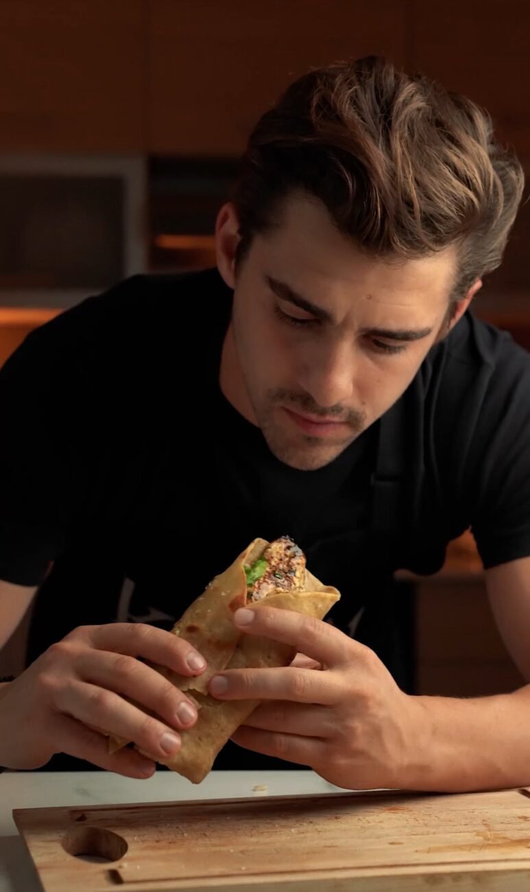 Συναρμολογούμε το Wrap μας ξεκινώντας με το αβοκάντο, προσθέτοντας το μαρούλι, το λαβράκι και την σάλτσα μας.