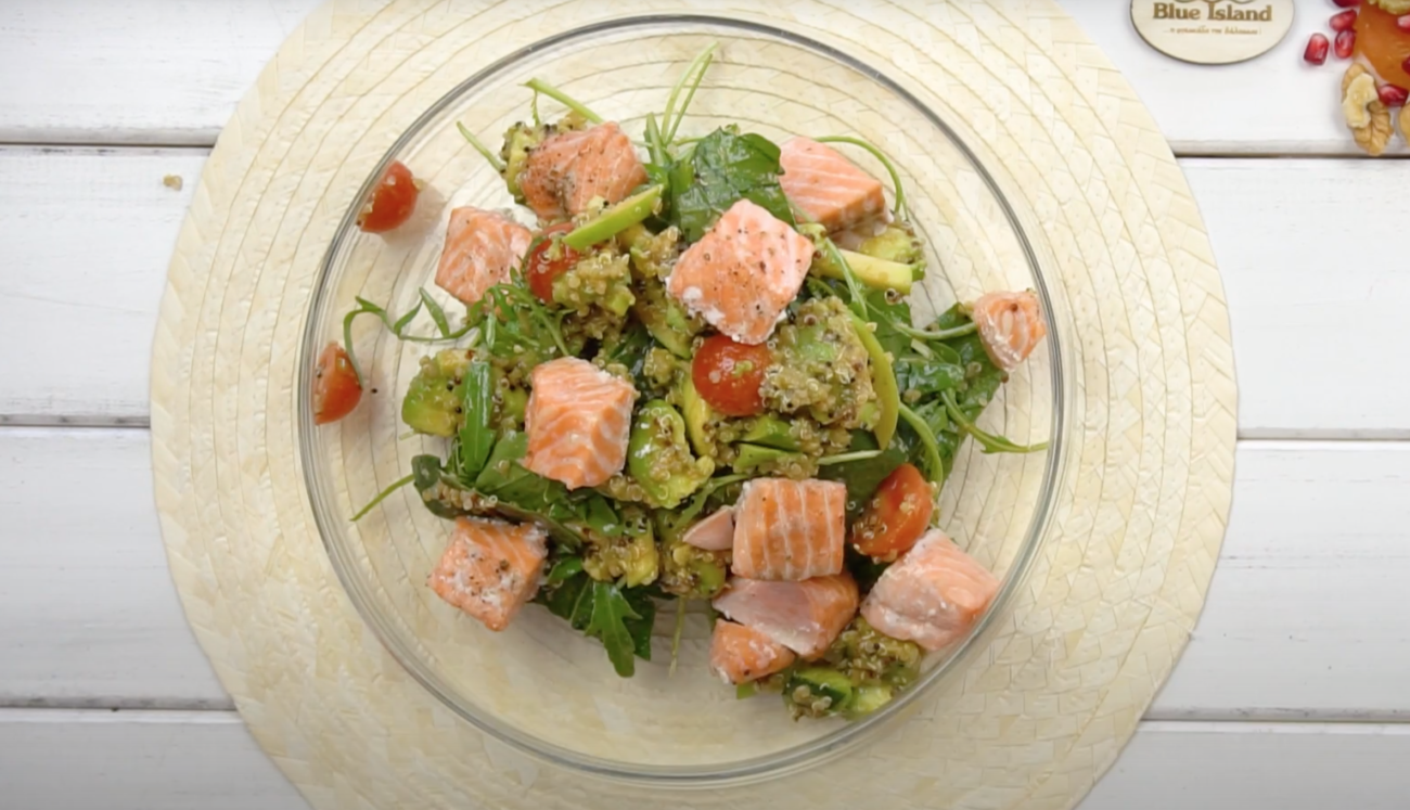 Κόβουμε το φιλέτο σολομού σε μεγάλους κύβους και τους τοποθετούμε σε ένα ταψί. Προσθέτουμε το ελαιόλαδο και το αλάτι. Ψήνουμε για 10 λεπτά και αφήνουμε να κρυώσουν.