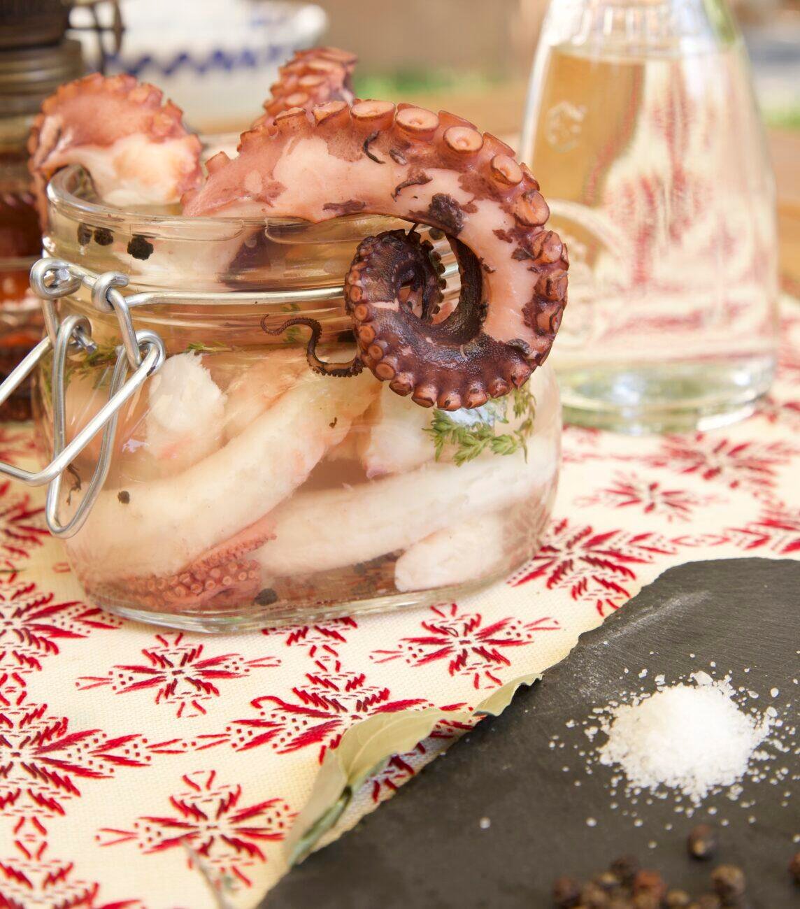 Στη συνέχεια τα αφαιρούμε από τη κατσαρόλα, τα στραγγίζουμε και κόβουμε ένα – ένα τα πλοκάμια. Αφαιρούμε την επιδερμίδα με τις βεντούζες. Ακολούθως απλώνουμε τα κομμάτια του χταποδιού σε καθαρή πετσέτα για να στεγνώσουν και τα τοποθετούμε σε καθαρά γυάλινα, και στεγνά βάζα.
