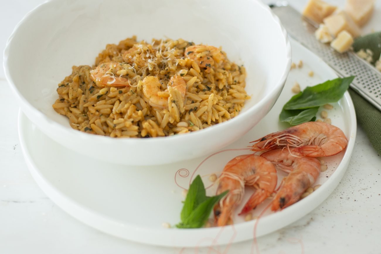 Orzo with prawn bisque and basil pesto