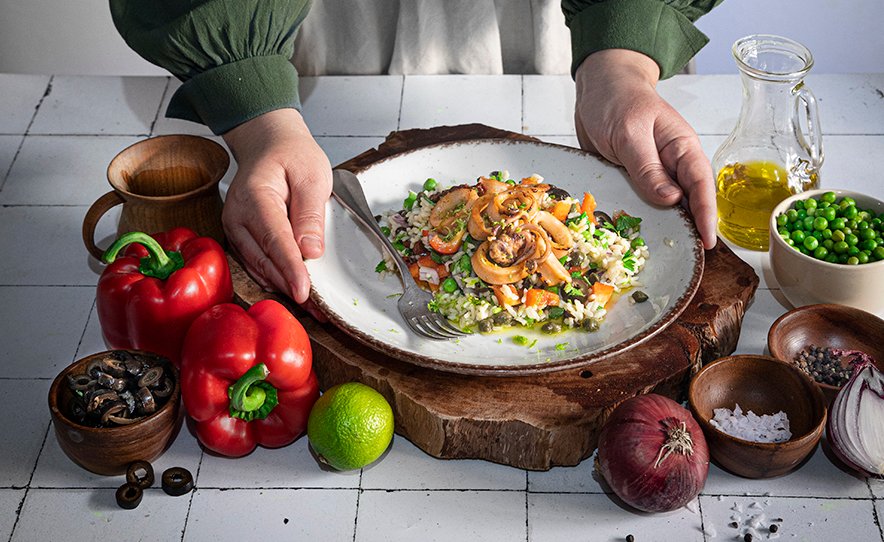 Salad with rice and calamari (squid)