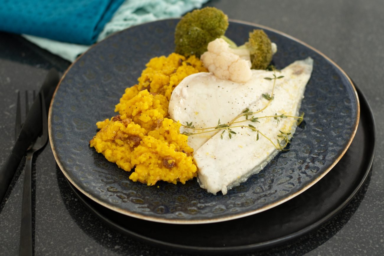Steamed sea bream with rice and vegetables Step 1 Place a bowl onto mixing bowl lid and weigh 40 g olive oil 5 g lemon zest, 8 g salt and 1 pinch ground pepper into it. Stir to com...