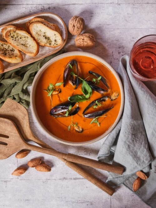 Purchase the fresh mussels from one of the Blue Island Fish Markets Get all the ingredients ready: 1. Cook the mussels 2. Make the tomato soup 3. Serve Method: Fry the onions and