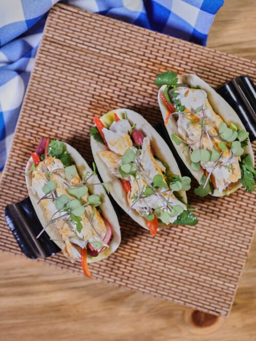 Visit a Blue Island fish market for your sea bass fillets. Marinate the fillets. Bake the fillets. Prepare the sauce. Prepare the other ingredients. Prepare the tacos. Serve. Execu