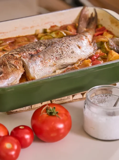 Tomato-Roasted Red Porgy with Vegetables (Inspired by the traditional “Fish Protéto”)