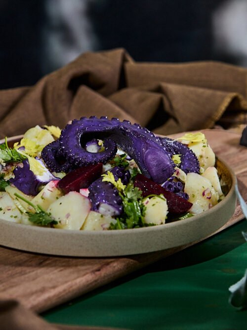 Marinated Octopus in Red Cabbage with Potato Salad