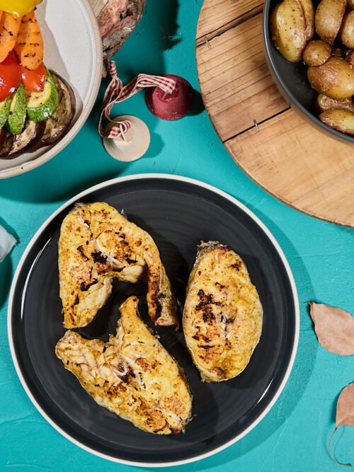 White grouper Steak marinated with orange and ginger served with grilled vegetables and sautéed potatoes