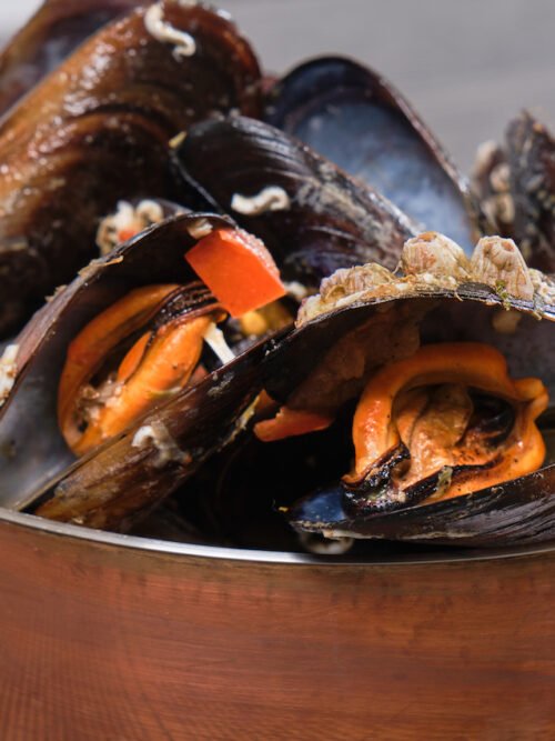 Fresh Black Mussels with Fresh Tomato and Basil served with Crunchy Toasted Bread