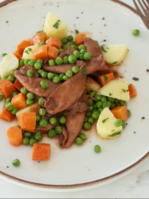 Calamari in tomato sauce with flavored potatoes and vegetables