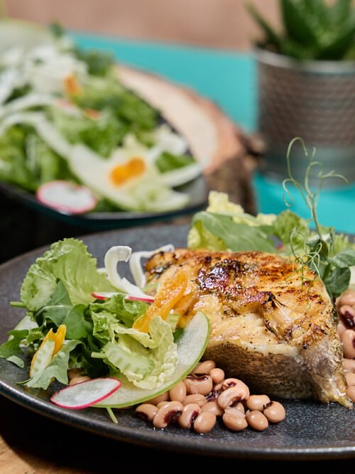 Grouper Steak with honey and thyme served with green salad and black-eyed beans