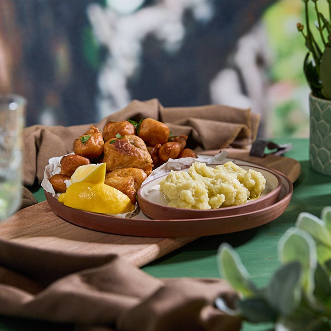 For frying: Rinse the cod well under running water. Pat dry with kitchen paper and cut into bite-sized pieces. Heat plenty of sunflower oil in a pot. Place flour in a bowl and flour the cod pieces. Shake off the excess flour. Take the batter out of the fridge and dip the cod pieces in it. Fry in the hot oil for 5-6 minutes on each side or until evenly golden and the batter is crispy. Remove to a plate lined with kitchen paper to absorb the excess oil.