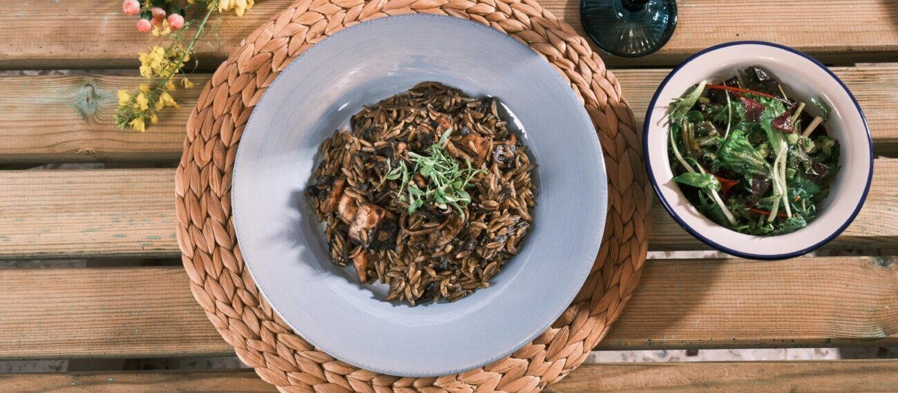 Next, add the pasta (orzo) and the vegetable stock, season to taste with salt and pepper, and stir well. Let it boil for 2 minutes, and then cover the pan with a towel and then the pan lid. Remove from the heat and leave for twenty minutes for the pasta to cook fully.