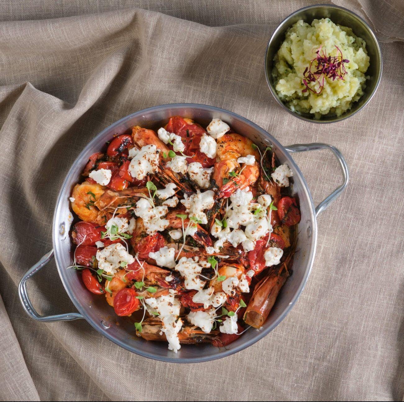 Prawn Saganaki with Limoncello and Goat Cheese served with Garlic – flavoured Potato Dip