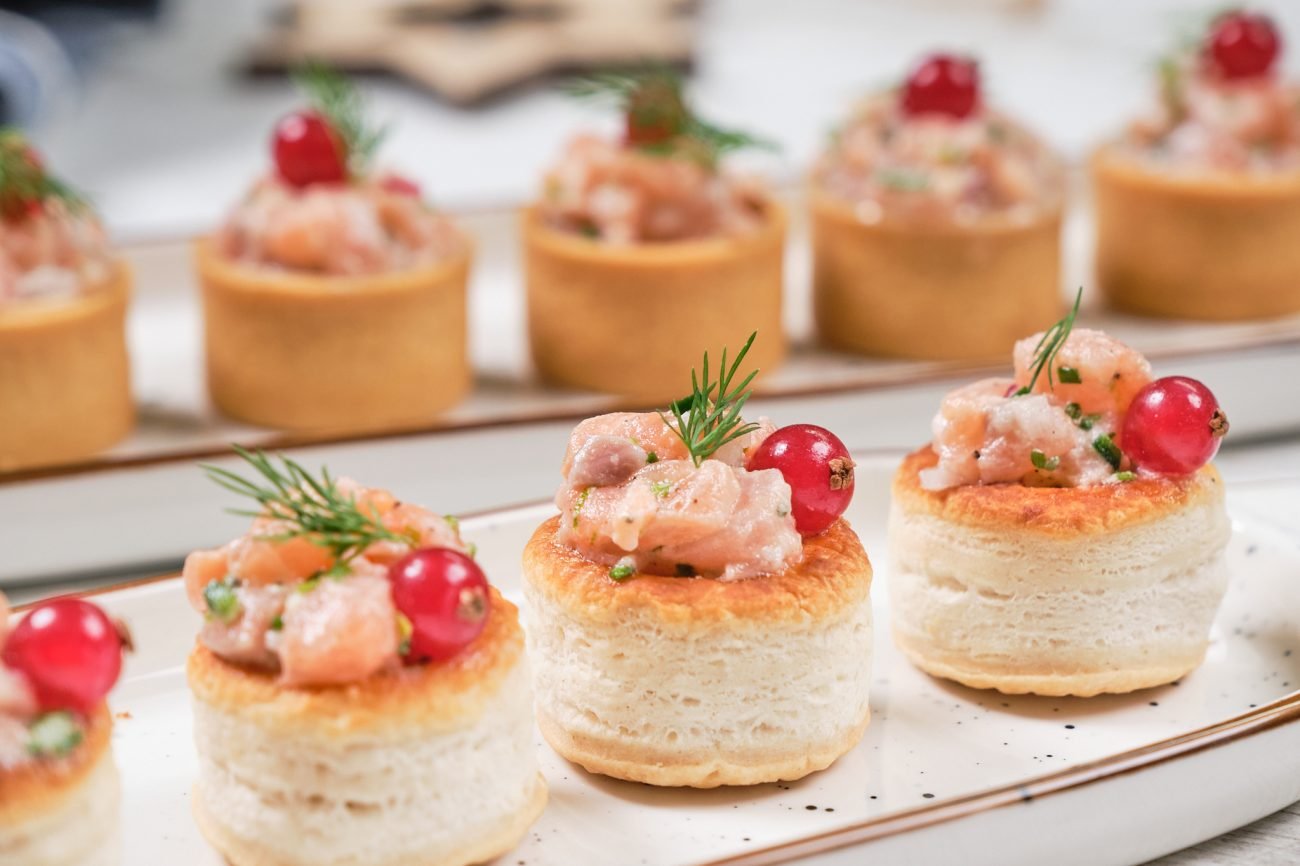Place the Salmon together with the champagne, chives, zest and lime juice, orange juice, jalapeño, radish and salt into a bowl. Mix with a spoon and fill the tartlets.