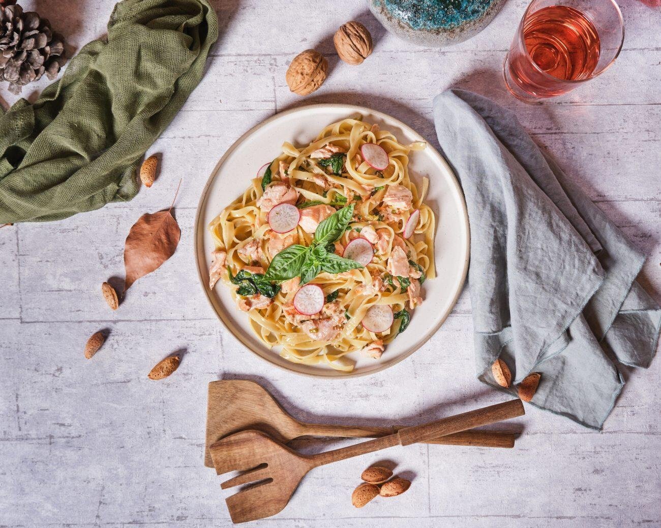 Tagliatelle with Salmon Fillet with Mustard, Honey and Spinach